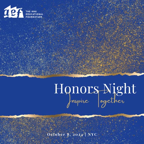 The Honors Night gala recognizes one outstanding organization from each of AEF's constituencies – marketers, agencies, and media – for its accomplishments in the industry and its support of the AEF mission. A Lifetime Achievement Award and Inspire Award are also presented to individuals for their exceptional contributions.