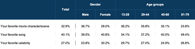 Respondents said the use of a favorite song in a Super Bowl ad was more memorable than a favorite movie character/scene or a favorite celebrity.