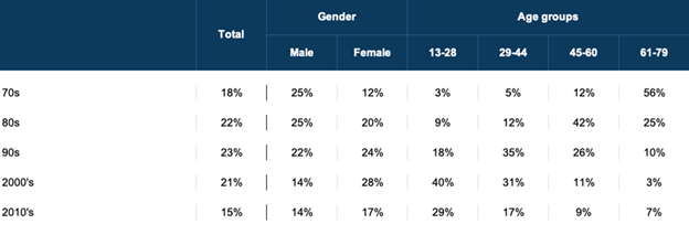 When it comes to favorite musical decades, there is — not surprisingly — an age factor. Conventional wisdom holds that people are deeply fond of music from their adolescence. However, the 2010's are not any generation's favorite decade (yet), with gen Z preferring the 2000's of their childhoods.