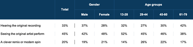 When ads use nostalgic songs, original artists and recordings have more appeal than updated versions. A majority of gen Z want to see the original artist perform.