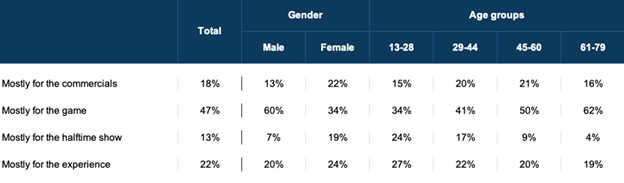 The game itself is the biggest draw for all viewer groups. The percentage of women watching "Mostly for the game" has been rising in recent years and now stands at 34 percent, compared with 20 percent three years ago. And viewers watching "Mostly for the commercials" continue to skew female.