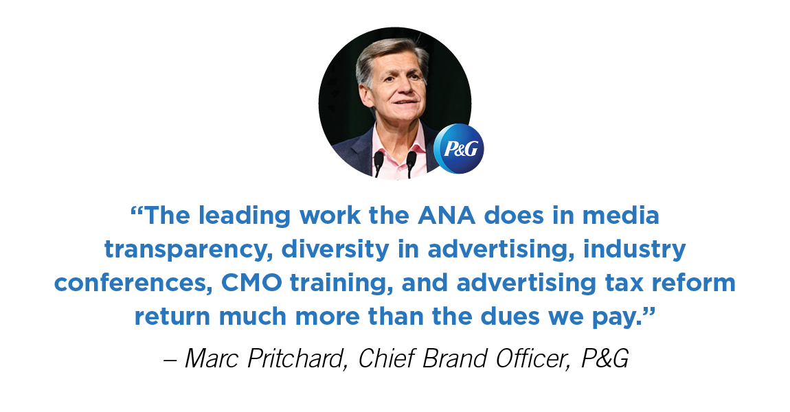 As the voice of the industry, the ANA provides the advertising community with a voice before Congress, state legislatures, Federal regulatory agencies, and the courts. We also challenge our members and the industry to collaborate as a community and leverage their leadership for business and brand growth.