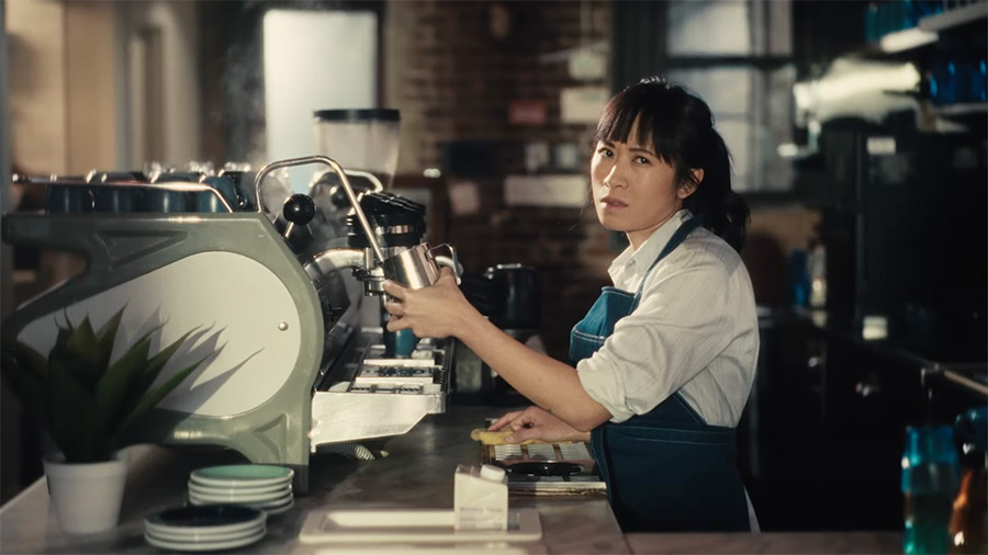 A barista looks on skeptically at a woman standing atop a table in a coffee shop, proclaiming she uses "Zoom in this coffee shop." The ad is part of Zoom's new brand campaign, "Zoom Ahead." Zoom/YouTube